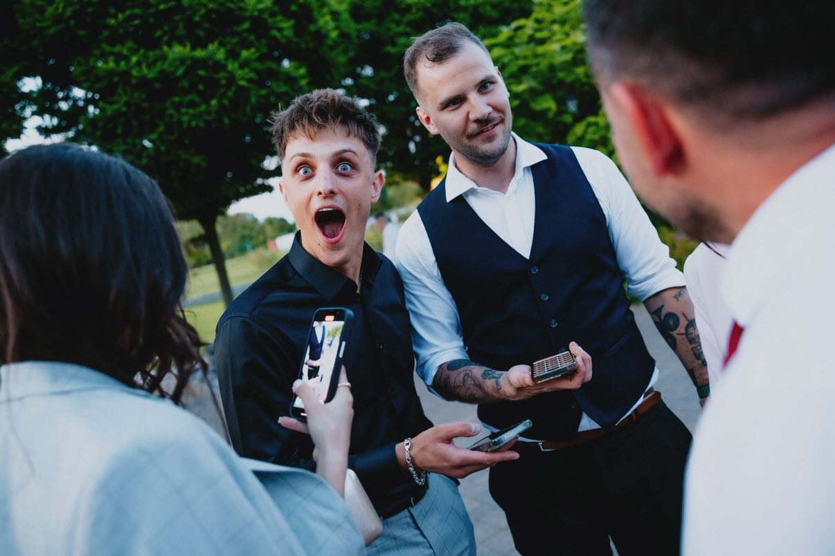 Pokaz iluzji działa jak świeży powiew. Przerywa przewidywalność wieczoru i dodaje mu element tajemnicy. Goście na chwilę odrywają się od rozmów przy stole i tego, co „zwykle dzieje się na weselu”, bo nagle pojawia się coś, co trudno wytłumaczyć logiką. To właśnie efekt „wow” jest największą siłą magii. W jednej chwili sala reaguje wspólnie: ktoś wybucha śmiechem, ktoś inny przeciera oczy ze zdumienia, a po trikach wracają rozmowy, ale już na innych obrotach. Stają się pełne emocji i ekscytacji.